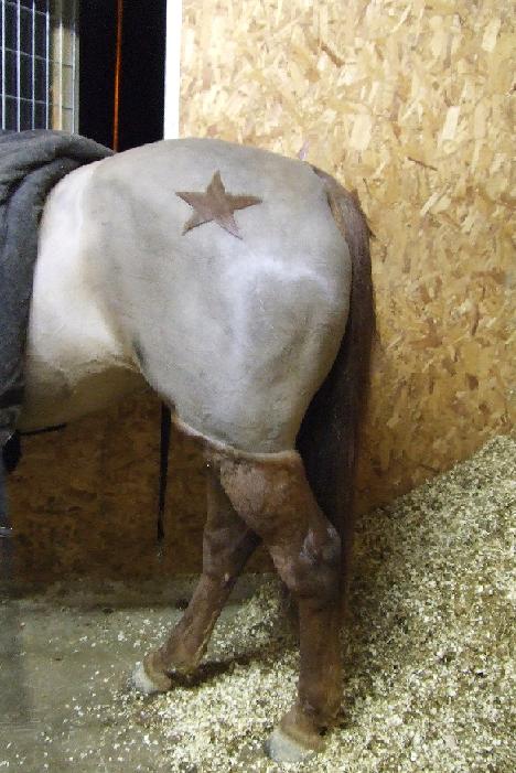 You can buy stencils for clipping shapes onto horse’s coats but it is actually really easy to do it yourself and clip a shape onto the quarters or the shoulder. This year so far I have done a heart, star, lightening bolt and the letters J and T. You can cut the shape out of cardboard and clip around it or draw the shape on with chalk/non permanent marker or create the shape using strips of insulating tape and clipping around it. With a bit of practice you will find it easy to create basic shapes freehand even with a regular clipper. I always advise though not to clip the opposite side until you have the shape done – that way if it goes wrong on one side you can always clip it out and try again on the other.